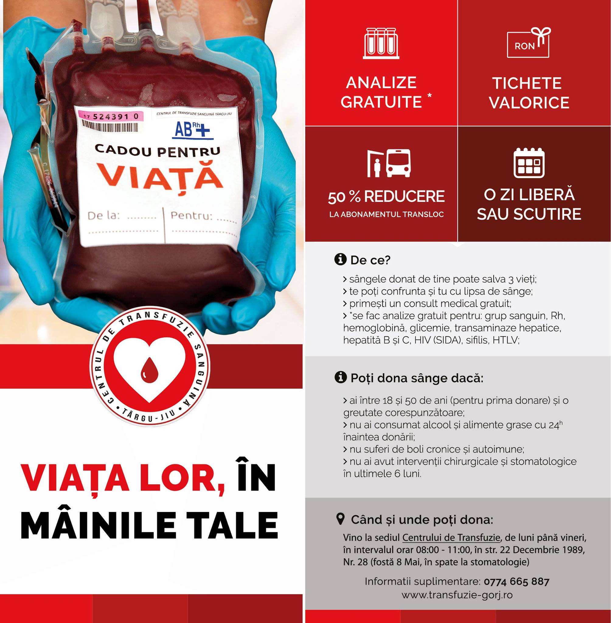 Poți să donezi la Centrul de Transfuzie Sanguină Gorj, din strada 22 Decembrie, nr. 28, județul Gorj.